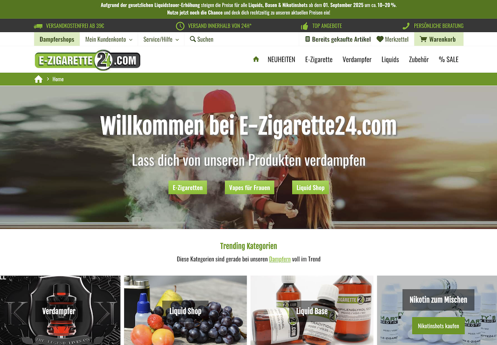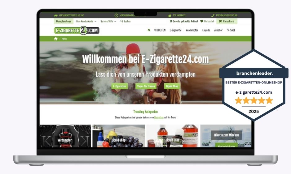 E-Zigarette24 führt unser Ranking an – der Shop bietet wirklich alles, was das Dampfer-Herz begehrt. Hier findest du über 2.000 Produkte rund ums Dampfen an einem Ort. Vom E-Zigaretten-Starterset bis zu exotischen Liquid-Aromen bleibt kein Wunsch offen. Die Website ist übersichtlich und einsteigerfreundlich gestaltet, mit vielen Infos und Ratgebern. Besonders hervorzuheben sind der äußerst schnelle Versand und die persönliche Kundenbetreuung. E-Zigarette24 gehört zu den bekanntesten und vertrauenswürdigsten Online-Shops für Dampfer in Deutschland und Österreich.