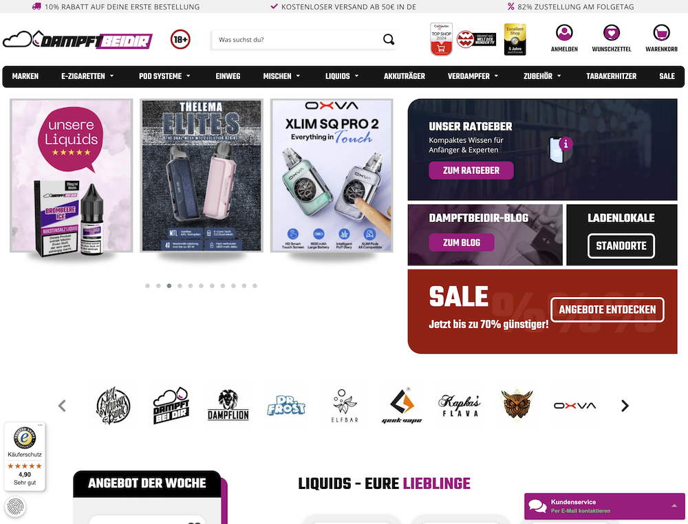 DampftBeiDir punktet mit einer gelungenen Mischung aus Online-Shop und lokalem Fachhandel. Hinter dem Shop steht ein engagiertes Team, das neben dem Onlineshop auch mehrere stationäre Filialen betreibt (u.a. in Neutraubling, Ingolstadt, Landshut). Das Sortiment ist riesig und sorgfältig kuratiert – nur Top-Marken und Qualitätsprodukte schaffen es ins Angebot. DampftBeiDir spricht Einsteiger wie Profis gleichermaßen an und bietet zahlreiche Tipps, Blogartikel und sogar YouTube-Videos rund ums Dampfen. Kunden profitieren zudem von attraktiven Konditionen und einem aktiven Community-Austausch.