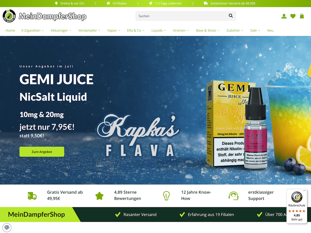MeinDampferShop zeichnet sich durch eine besonders persönliche Note aus. Der Slogan „Dein E-Zigaretten Shop mit Herz & Erfahrung“ ist hier Programm. Hinter dem Online-Shop steht ein Team von rund 40 erfahrenen Dampfer*innen, das mit Leidenschaft bei der Sache ist. MeinDampferShop betreibt zudem 18 Filialen in Deutschland, versorgt also offline wie online die Dampfer-Community direkt aus einer Hand. Das Sortiment ist riesig und wird ständig an neue Trends und Kundenwünsche angepasst – wenn etwas fehlt, bemüht man sich, es schnell ins Angebot aufzunehmen. Kunden schätzen vor allem die ehrliche Beratung und den schnellen Versand.