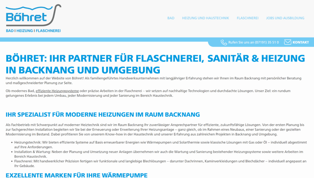 Die Firma Böhret hat sich in der Region als feste Größe etabliert und bedient das Servicegebiet Backnang mit einem umfassenden Leistungskatalog. Dieser Heizungsbauer in Backnang stach in unserem Vergleich hervor, weil er traditionelles Handwerk konsequent mit modernen Energielösungen verknüpft. Böhret versteht sich als Partner für die gesamte Lebensdauer deiner Heizungsanlage – von der ersten Planung über die Montage bis hin zur regelmäßigen Wartung. Besonders hervorzuheben ist die starke Kundenorientierung und schnelle Hilfe im Notfall, was gerade bei Heizungsausfällen ein entscheidender Faktor ist.