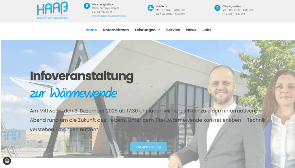 Die Haaß GmbH & Co. KG ist uns durch ihre sehr moderne Ausrichtung und den Fokus auf innovative Gebäudetechnik aufgefallen. Das Unternehmen hat sich stark in Richtung komplexer, energieeffizienter Systemlösungen entwickelt und geht über das klassische Gas- und Ölgeschäft hinaus. Haaß ist eine geeignete Adresse für alle, die eine zukunftssichere Lösung suchen, die auch Themen wie die kontrollierte Wohnraumlüftung in die Planung mit einbezieht, sowohl im Privat- als auch im Gewerbebereich.