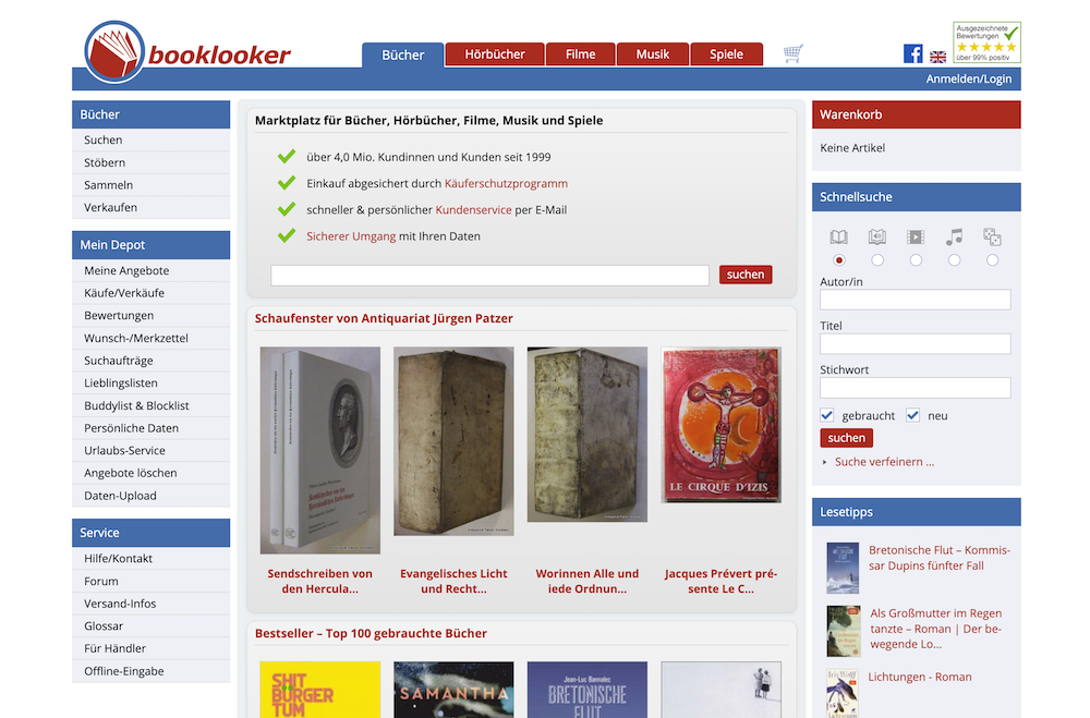 Booklooker ist ein Marktplatz statt eines Ankaufdienstes. Hier verkaufen Sie Ihre Bücher direkt an Endkunden. Sie legen selbst den Preis fest und zahlen nur im Erfolgsfall eine Provision. Der Verkaufsprozess ist etwas aufwendiger, aber dafür lassen sich für besondere Bücher gute Preise erzielen. Ideal für Geduldige und Sammler.