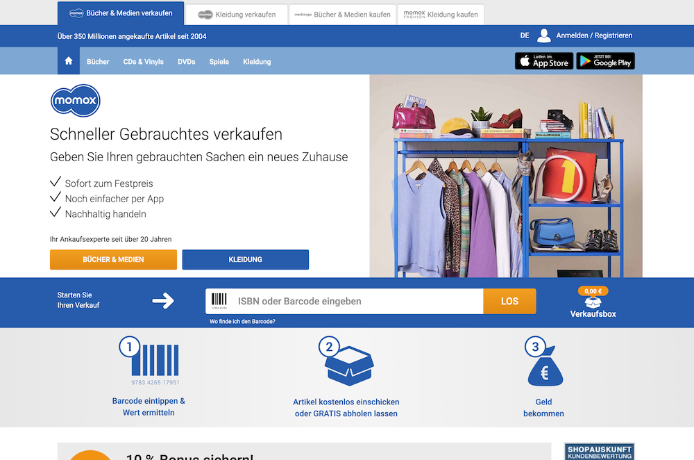 Momox gilt als der Vorreiter unter den Online-Ankaufsdiensten für gebrauchte Bücher in Deutschland. Das Unternehmen kauft neben Büchern auch Medien wie CDs, DVDs und Spiele an. Der Verkaufsprozess ist unkompliziert: ISBN eingeben oder per App scannen – sofort Preisvorschlag erhalten. Versand und sogar Abholung sind kostenlos ab einem Mindestwert. Die Auszahlung erfolgt nach Prüfung direkt aufs Bankkonto. Momox eignet sich besonders für den Verkauf gängiger Titel in größeren Mengen.