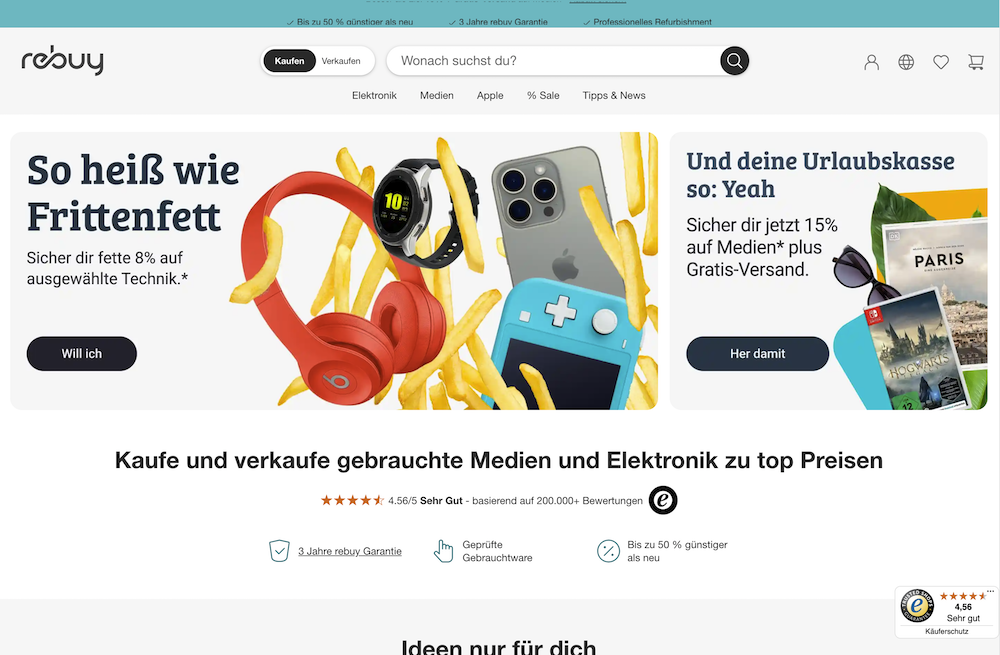 Rebuy ist ein weiterer großer ReCommerce-Anbieter. Neben Büchern können hier auch Elektronikgeräte verkauft werden. Der Ablauf ist dem von Momox ähnlich. Ab einem bestimmten Warenwert erfolgt der Versand kostenlos. Die Auszahlung erfolgt über das Kundenkonto, von dem das Geld auf das Bankkonto transferiert werden kann. Eine nützliche App vereinfacht den Scanprozess.