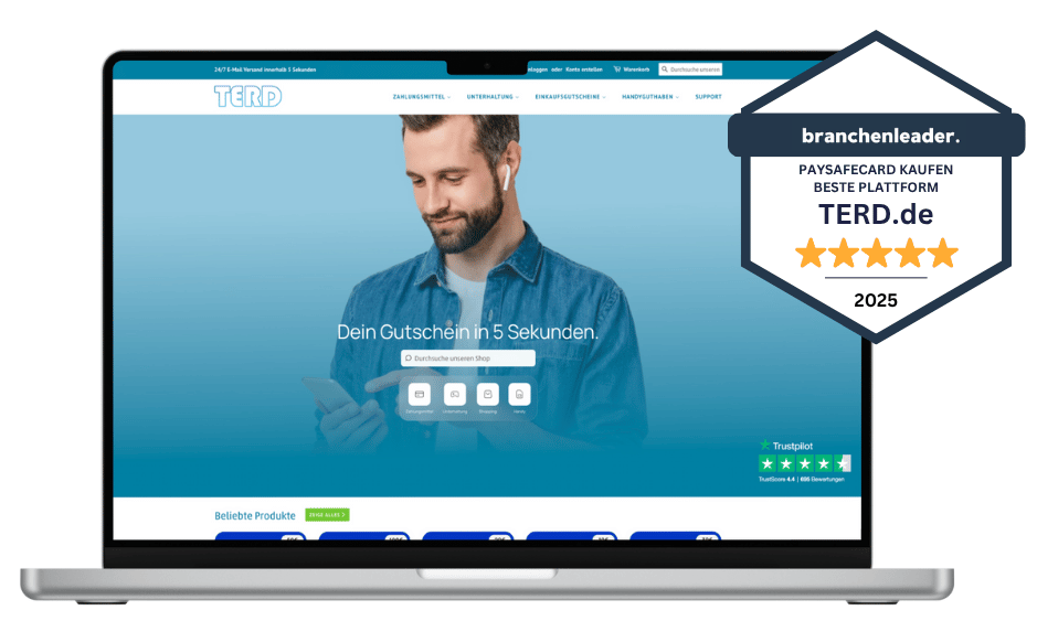 Terd.de steht an erster Stelle unserer Liste – nicht nur, weil die Plattform sich gezielt an Online-Käufer in der DACH-Region richtet, sondern vor allem dank ihrer herausragenden Geschwindigkeit und Flexibilität. Bei Terd erfolgt der Versand des Paysafecard-Codes rund um die Uhr innerhalb von 5 Sekunden per E-Mail. Schneller geht es kaum: Sie bekommen den 16-stelligen PIN-Code praktisch sofort nach dem Kauf und können direkt damit bezahlen, ohne Wartezeit.